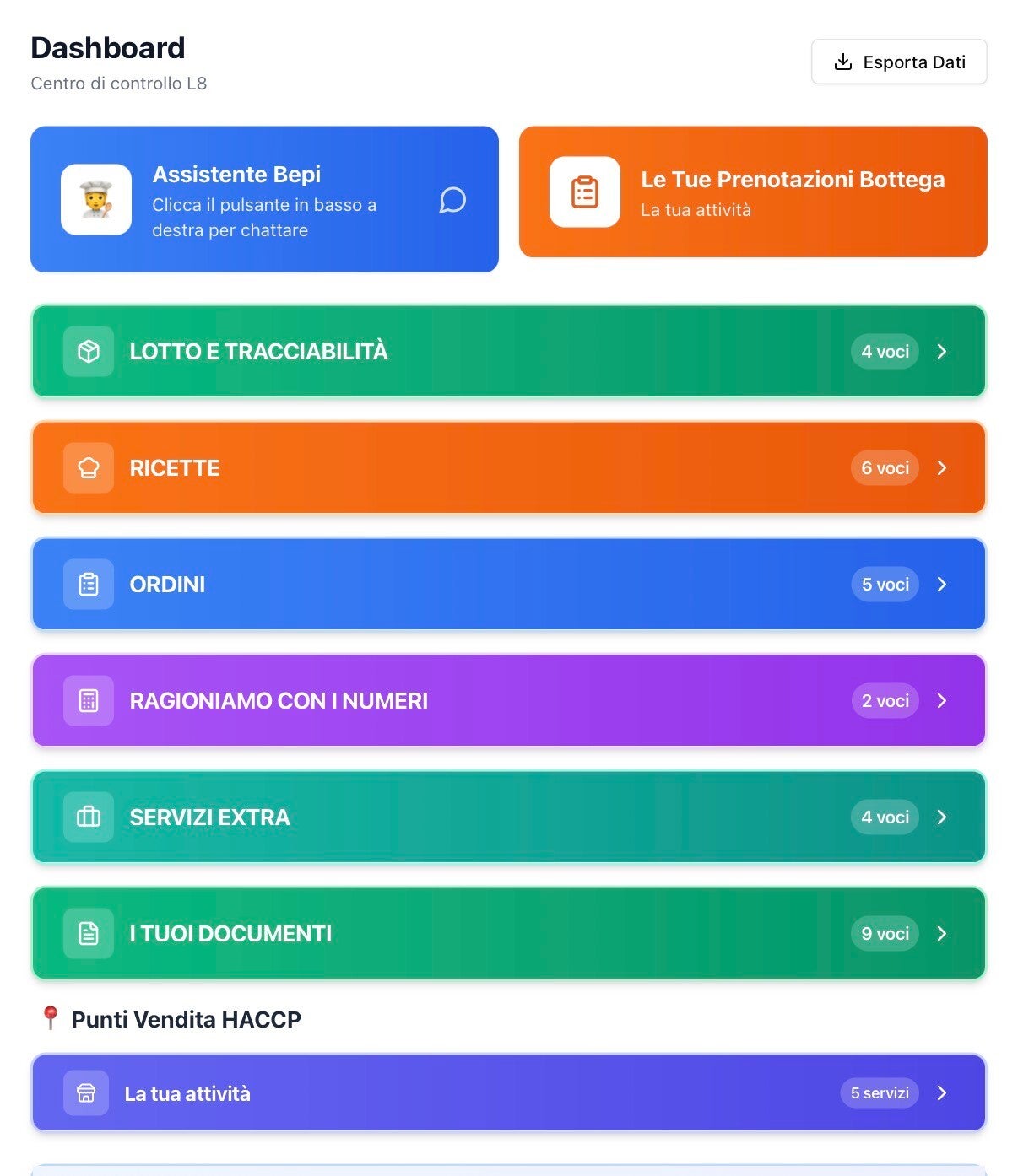 L8 è una web app per operatori del settore alimentare che integra in un unico sistema la gestione di ricette, food cost e calcolo automatico dei margini.